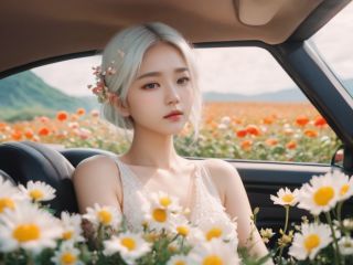 ethereal fantasy concept art of cinematic film still, chinese girl, a girl with white hair sitting in car filled with flowers, art by Rinko Kawauchi, in the style of naturalistic poses, vacation dadcore, youth fulenergy, a cool expression, body extensions, flowersin the sky, analog film, super detail, dreamy lofi photography, colourful, covered in flowers andvines, Inside view, shot on fujifilm XT4 . shallow depth of field, vignette, highly detailed, high budget, bokeh, cinemascope, moody, epic, gorgeous, film grain, grainy . magnificent, celestial, ethereal, painterly, epic, majestic, magical, fantasy art, cover art, dreamy