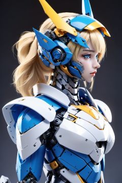 masterpiece,best quality,(photorealistic:1.4),(ultra detailed:1.3),unity 8k wallpaper,mecha musume, mechanical parts, robot joints, headgear, full armor,1girl, solo, (masterpiece, best quality, high quality, highres, ultra-detailed),color_theme,mecha musume, mechanical parts, robot joints,headgear,full armor,1girl, solo, blue eyes, blonde hair, mecha musume, breasts, joints, ponytail, robot joints, looking at viewer, gradient background, gradient, armor, medium breasts, headgear, closed mouth, science fiction, from side, profile, mechanical parts, lips