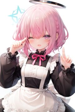 1girl, solo, apron, halo, hair over one eye, closed eyes, smile, white background, dress, white apron, simple background, long sleeves, multicolored hair, braid, open mouth, blue hair, alternate costume, blush, bangs, :d, pink hair, black dress, ribbon, frilled dress, enmaided, short hair, hand up, colored inner hair