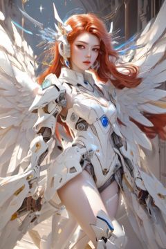 1girl, Porcelain white mech, nabel, high-heels, mecha, Mechanical wings, space, Future wars, hime cut, hair over shoulder, red hair, hair spread out, very long hair, projected inset, dutch angle, f/2.8, Sony FE GM, UHD, award winning, 16k, masterpiece