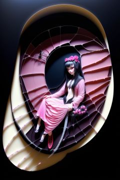 (masterpiece:1.3), (girl sitting in transparent spider abdomen:1.5), (dark cave, dark background:1.4), fluorescent, intricate, full body,surreal,breathtaking,incredible,(best quality),(ultra-detailed, high resolution, extremely detailed),yuzu,1 girl,red eye, ,Pink Mecha,mature male,huliya,bp-homura