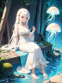A girl with white hair, all over, sitting on a jellyfish, giant jellyfish,