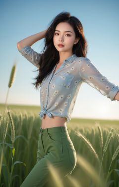 Ultra-high skin detail, Perfect facial details,black hair, big hair, clover hair ornament, mole under eye, light smile, head out of frame, projected inset, f/1.8, 135mm, Fujifilm,Under the blue sky, In a green wheat field, a girl in a floral shirt and jeans is dancing,solo,(Long legs:1.2),Printed trousers,The background is the wheat field. Dusk, lens flare, cinematic lighting, UHD, anatomically correct, textured skin, high details, award winning,