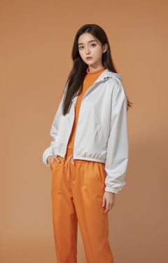 (masterpiece:1.4),(best quality:1.4),(ultra-detailed:1.2),high quality,highres,ultra high res,(RAW photo:1.2),extremely detailed,finely detail,,1girl,((long hair)),beautiful detailed eyes,(((full body))),(duobaca),hermes orange background,white windbreaker, sneakers,sc,