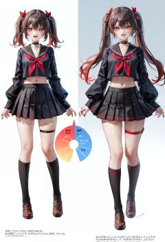 multiple views, (sketch:1.25), shy, best quality, graphite \\(medium\\), ske, gradient, rainbow, (note:1.2), Line draft, highres, absurdres, (ultra-detailed:1.1), (illustration:1.1), (infographic:1.2), pajamas, (all clothes configuration:1.15), (solo), perfectly drawn hands, standing, cohesive background, paper, action, (character design:1.1),<lora:hutaonew-v3-v100-000026:0.85:char>,hutao, skirt, butterfly, twintails, long hair, school uniform, solo, bug, brown hair, socks, midriff, serafuku, pleated skirt, full body, red eyes, crop top, choker, very long hair, black skirt, thigh strap, long sleeves, kneehighs, simple background, black serafuku, black socks, smile, open mouth, looking at viewer, navel, flower,<lora:EnvyBetterHands LoCon_beta2 辅助:1>,good hands,nice hands,(beautiful_face), ((intricate_detail)), (revealing clothes:1.2), clear face,((finely_detailed)), fine_fabric_emphasis,((glossy)),