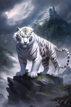 A white tiger stands atop a dark and ominous mountain, surrounded by dense clouds. Accompanied by the roars of thunder and the flashes of lightning, its snow-white fur appears pale and mysterious in the dim light. The tiger's green eyes flicker with wildness and alertness, exuding a sense of formidable and unpredictable power.