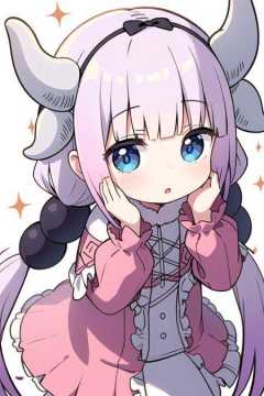 1girl, <lora:Kanna5-15:1>, kannakamui, dress, dragon horns, hands on own cheeks, :o, hair beads, low twintails, sparkle,
