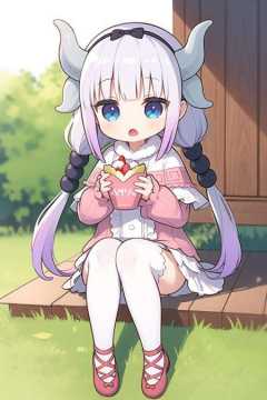 1girl,  <lora:Kanna5-15:1>, kannakamui, dress, dragon horns, hair beads, low twintails, outdoors, thighhighs, open mouth, holding parfait, sitting,