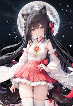 1girl, long hair, solo, thighhighs, black hair, hair ornament, moon, japanese clothes, skirt, detached sleeves, white thighhighs, miko, hakama short skirt, hair flower, very long hair, ribbon trim, ribbon-trimmed legwear, full moon, hakama skirt, hakama, brown eyes, outdoors, night, standing, looking at viewer, flower, hand on hip, tree, red skirt, sky, wide sleeves, smile, ribbon-trimmed sleeves, star (sky), fence, blush, bangs, zettai ryouiki, bare shoulders, night sky, red eyes, nontraditional miko, red hakama, thighs, closed mouth