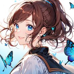 brown hair,blue eyes, butterfly, short hair, rococo,high ponytail, light red hair, wavy hair,court poet,smile, <lora:n (7):1>,anime style,[anime style],bright sunlight,, fcportrait
