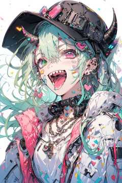 (masterpiece:1.2), best quality,PIXIV,Rebellious girl,portrait, 1girl, solo, tongue, hat, teeth, jewelry, sharp teeth, green hair, multicolored hair, looking at viewer, green eyes, open mouth, jacket, tongue out, piercing, necklace, heterochromia, ear piercing, upper body, bandaid, horns, baseball cap, hair between eyes, choker, bandaid on face, black shirt, pink eyes, earrings, bangs, simple background, hair ornament, smile, heart, open clothes, white background, open jacket, collar, badge, shirt, chain, chain necklace, streaked hair, white jacket, hairclip, spikes <lora:Rebellious girl_20230813171407:1>