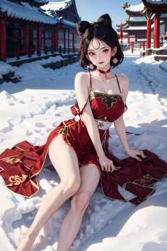 masterpiece,best quality,1 girl, daji, smille, red dress, chinese clothes, bare shoulders, pink earrings, full body, Lying in the snow naturally, In ancient China, The Legend of Deification, wearing a purple gauze skirt, In the snow, delicate luster, clean background, and soft film lighting, <lora:daji_v1:0.8>