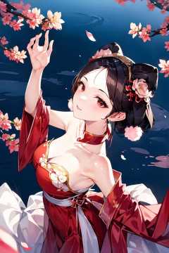 masterpiece,best quality, (top view),Aerial view, 1 girl, daji, smille, red dress, chinese clothes, bare shoulders, pink earrings,By the lake, peach blossoms, butterflies, petals flying <lora:daji_v2:0.8>