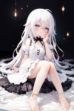 //,masterpiece, ((best quality)), (ultra-detailed), (illustration), an extremely delicate and beautiful, dynamic angle, chromatic aberration,((Medium shot)), ((colorful)),//,1girl,little girl,1girl,loli,petite,loli,looking away,Black rimmed glasses,dress,Constellation print,anklet,barefoot,sitting,(white hair:1.3),(long hair:1.3),ahoge,purple eyes,open mouth,(Dim light),classical,library, plant, Oil lamp,