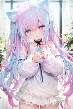 cowboy shot, masterpiece,Splash color, soft lighting,(cocktail glass), 1girl, solo, cat ears, multicolored hair, ((gradient hair), white+(blue)+(pink:0.5) hair//), very long hair, messy hair, bangs, ahoge, ((gradient eyes), pink+light_blue eyes//), slit pupils, glowing eyes, 1fang, white sweater
