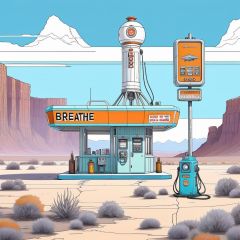 coloring book page, blackwork, in a style of simon stalenhag tales from the loop, retro futuristic style, An old, tiny abandoned gas station in the middle of the desert, (((signboard saying BREATHE))), mountains, ((on mountains there is a rusty huge sonic robot)), looking to viewer, cobweb, old, artstation, digital art,<lora:drawingstyle:0.8> <lora:drawingbooksdxl2:0.55>