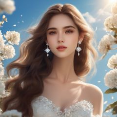 masterpiece, 1 girl, Look at me, Handsome, Black eyes, Long brown hair, Diamond stud earrings, white wedding dress, Upper body, Outdoor, Light blue sky, Clouds, Garden, Flying petals, There is plenty of sunshine, Close-up, Realism, textured skin, super detail, best quality