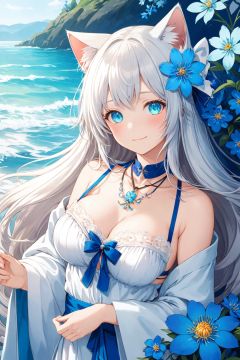ultra-detailed,(best quality),((masterpiece)),(highres),original,extremely detailed 8K wallpaper,(an extremely delicate and beautiful),((detailed face)),beautiful detail eyes,\\LineAniAFanime,shenji,small_breasts, {{loli}},{one girl}, very long light white hair, beautiful detailed blue eyes, aqua eyes, white robe, cat ears, {flower hairpin}, {surrounded by beautiful detailed blue flowers}, sunlight, light smile, beautiful detailed blue necklace, {{{see-through}}}, flower request, breast_focus, {luxuriant bra}, {{breast_conscious}}, presenting breast, {hand on breast},{covering_breasts},<lora:LineAniRedmond-LineAniAF:0.5>