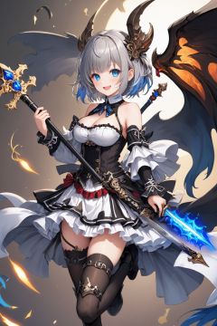 ultra-detailed,(best quality),((masterpiece)),(highres),original,extremely detailed 8K wallpaper,(an extremely delicate and beautiful),((detailed face)),beautiful detail eyes,\\1girl,horns,solo,demon wings,wings,tail,demon horns,grey hair,blue eyes,demon tail,black wings,twintails,white background,thighhighs,boots,simple background,frilled skirt,holding,weapon,full body,polearm,frills,smile,open mouth,navel,skirt,demon girl,looking at viewer,midriff,breasts,short hair,white thighhighs,garter straps,:d,black footwear,blush,tail ornament,holding weapon,hairband,detached sleeves,cross-laced footwear,bare shoulders,standing,tail ring,bangs,bridal\\