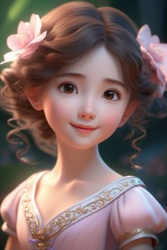 design,Pixar style,holding a pink flower,big eyes,smile,peach blossom,stream,