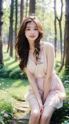 1 girl, floral pattern, long hair, alluring eyes, embellished clothing, natural light, shallow depth of field, romantic setting, dreamy pastel color palette, whimsical details, captured on film, (Original photo, best quality) , (Real, Photorealistic): 1.3), Clean, Masterpiece, Fine Detail, Masterpiece, Ultra Detailed, High Resolution, (Best Illustration), (Best Shadows), Delicate, Bright Light, (Field of View): 1.3), (miniskirt: 1.5), (white shoes: 1.4), long legs, forest, grass, (light: 1.5), (field of view: 1.3), (standing: 1.7), (smile)