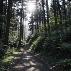 a beam of light in the forest,there is a small path,light shining on the path,intense light and shadow effects,