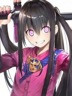 a perfect photo of a young girl, masterpiece, solo, 1girl, long hair, solo, black hair, smile, nail polish, looking at viewer, pink eyes, very long hair, bangs, covered navel, weapon, collarbone, holding, white background, hair ornament, purple eyes, sidelocks, skindentation, upper body, simple background, armpits, <lora:huafeng3:1>