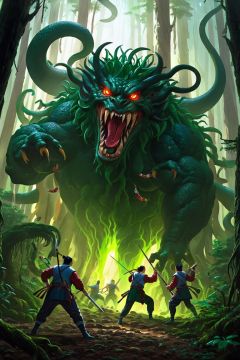 In this picture, we can see a cultivator and a fierceMiaojiang worm engaged in a fierce confrontation. Theworms are huge in size and covered with a hard shellexuding the aura of beasts in the forest. Practitionerswield magic weapons and used martial arts techniquesto constantly attack worms. The surrounding scene is alsofull of mysterious atmosphere, and hissing and strangebreaths are heard from time to time in the vast mountainforest. The author of this painting is the famous fantasypainter MichaelWhelan