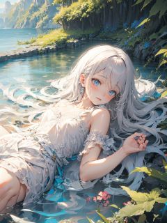 Star-shaped crystal, white dress, lying on the water, looking down at an angle,1girl
