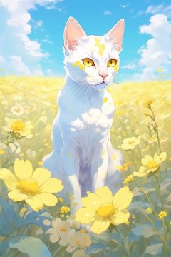 fantasydi,no humans, flower, outdoors, yellow flower, sky, animal focus, field, flower field, day, cloud, blue sky, looking at viewer, tongue, tongue out, cat, animal, open mouth