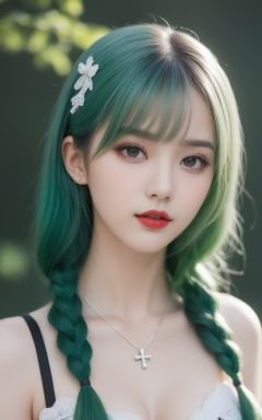 masterpiece, best quality, 1girl, solo, long hair, twin tails, hair buns, multicolored hair,two-tone hair, white hair, green hair, black hair,bangs, makeup, black lips, lipstick, mascara, eyeshadow, cross necklace, hair bow, front bow, lace jacket, lace gloves, fishnets, black leggings, gothic attire, dynamic angle, side lighting, shiny skin, detailed eyes, detailed face,