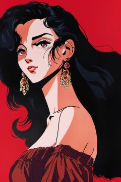 1980s \(style\), 1girl, solo, earrings, black hair, jewelry, long hair, red background, shadow, looking at viewer, upper body, hair over one eye, simple background, cleavage, breasts