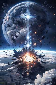 EpicSky, outdoors, sky, cloud, signature, no_humans, star_(sky), scenery, science_fiction, space, explosion, planet, earth_(planet), debris, destruction <lora:EpicSky-000006:0.8>, (masterpiece,best quality:1.5)