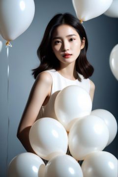 a cinematic fashion portrait photo of beautiful young woman from the 60s wearing  standing in the middle of a ton of white balloons,dramatic lighting,taken on a hasselblad medium format camera,looks like liu yifei,white balloon,