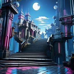 surespace, stairs leading to a castle, cyberpunk, best quality, ultra detailed,