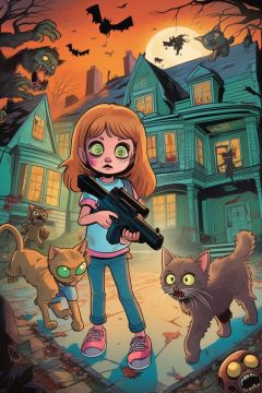 A little girl and a cat, fight with zombie, holding gun, zombie, look at viewer, only to discover that their new home is haunted by the ghosts of its former inhabitants, masterpiece, best quality,