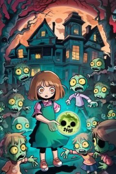 A little girl, holding word fight with zombie, look at viewer, only to discover that their new home is haunted by the ghosts of its former inhabitants, masterpiece, best quality, creepy, anime