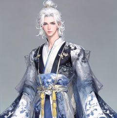 solo, 1boy, male focus, hair ornament, white hair, hair stick, long sleeves, chinese clothes, long hair, tassel, looking at viewer, hanfu, wide sleeves, blue eyes, jewelry, arms at sides, single hair bun, cowboy shot, closed mouth, robe, simple background, sash, hair bun, standing, grey background <lora:liangzai:1>