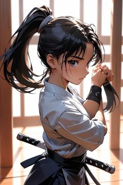 1 girl, teenager, sword, practicing, focused expression, long hair, black hair, tied in a ponytail, athletic build, determined, sword swinging motion, traditional clothing, dojo, wooden training sword, martial arts, concentration, intense training, sweat, dojo floor, sunlight streaming in, martial arts master, wooden panels, dojo mats, disciplined, precision, dedication, graceful movements, martial arts uniform, training session.