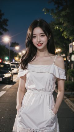 a woman standing on the side of a road at night,off shoulder,lace-trimmed dress,long hair,seductive smile,looking at viewer,ground vehicle,night,hands in pockets,blurry background,black hair,bokeh,brown hair,outdoors,red lips,<lora:ChineseDollLikenessV2.0:0.5:FACE>,