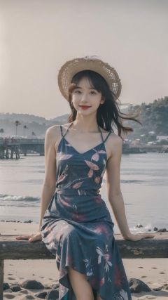K raw photo, Best quality, masterpiece, ultra high res, 1girl, natural skin texture, realistic eye and face details, full lips, fluffy hair, beautiful legs, tall female, skinny, slim_legs, solo, fluffy hair, sitting, (looking at viewer:1.28), raw photo, Best quality, masterpiece, ultra high res, 1girl, natural skin texture, realistic eye and face details, full lips, fluffy hair, beautiful legs, tall female, skinny, slim_legs, solo, fluffy hair, , sitting, (looking at viewer:1.2), full body,, closed mouth, black eyes, bangs, red lips, <lora:FilmgirlLora_v30:0.7>,(happy.smile),,(extremely detailed CG unity 8k wallpaper), photo of the most beautiful artwork in the world, trending on ArtStation, trending on CGSociety, Intricate, High Detail, Sharp focus, dramatic,volumetric lighting, rim lighting, two tone lighting, cinematiclighting, rim lighting, light particles, sunlight,,(Tropical_print_maxi_dress:1.5),(Straw_wide-brim_hat:1.4),(Woven_slides:1.3),(Beach_pier_background:1.4)<lora:cuteGirlMix4_v10:0.5>,<lora:ChineseDollLikenessV2.0:0.5:FACE>,