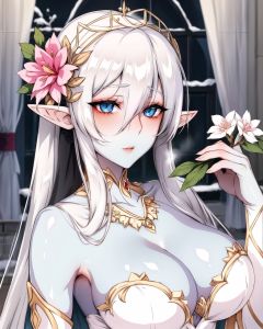 Close up, wearing crystal flowers on her head, silk gauze, the beautiful girl has an elf like appearance, lace, medium breasts, long stockings, and gorgeous jewelry all over her body. Her snow-white hair is flowing, and she has a fleshy feeling,She is a dark elf, (her skin is Brown:1.2),, masterpiece, best quality,