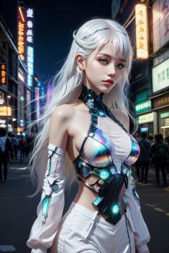 official art, unity 8k wallpaper, (ultra detailed), beautiful and aesthetic, beautiful, masterpiece, best quality, (1girl:1.3), (long hair, white hair:1.4), mature female, cyberpunk, mecha, sexy, iridescent eyes, starry sky, standing, futurecamisole,street, neon light,upper_body