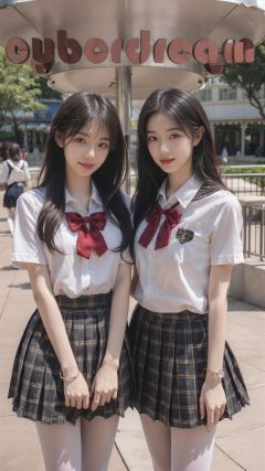 masterpiece,bestquality,realistic,8k,officialart,ultrahighres,2girls,teenager,kawaii,skinny,beautifly face,seductive smile,short sleeves,jk_style,jk_skirt,jk_shirt,(striped),jk_bow,outdoors,<lora:JK_style:0.3:CLOTHING>,slim legs,white pantyhose,brown shoes,perfect waist to hip ratio,fashionable accessories,<lora:jk制服白丝裤袜serafuku white pantyhose and l_1.0:0.6>,<lora:小怡同学:0.6>,multiple girls,skirt,2girls,black hair,school uniform,bag,looking at viewer,brown eyes,cosplay,hair ornament,smile,plaid skirt,long hair,jewelry,realistic,lips,bracelet,shirt,backpack,brown hair,real world location,solo focus,carousel,disneyland,