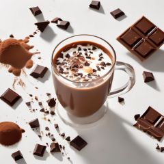 A photograph of a chocolate milk tea mixture presents a visual beauty and appeal. The rich chocolate aroma, mixed with the sweetness of milk, creates an intoxicating atmosphere. In the center of the drink is a dark brown chocolate juice mixed with small particles of chocolate and milk, surrounded by a white milk foam. Liquid splashes and bubbles burst, creating a dynamic atmosphere. The whole picture is full of vitality and vividness, making people want to taste this cup of chocolate milk tea.