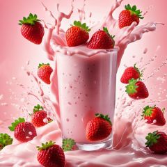 Splashing liquid, falling fruit,A photo of a strawberry milk mixture presents a visual beauty and appeal. Bright colors, mixed with elements of strawberry and milk. The center of the drink is pale pink strawberry juice mixed with some fresh strawberry pulp, while the surrounding is white milk foam,