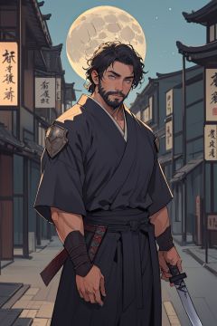 1man,masterpiece,best quality,detailed background,solo,muscular male,cowboy_shot,street,east asian architecture,full moon,japanese armor,holding katana,looking at viewer,beard,detailed eyes,beautiful eyes,standing,depth of field,