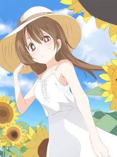 jianniai,masterpiece, best quality, 1girl, sunflower, solo, outdoors, white sundress, brown hair, upper body, day, closed mouth, brown eyes, looking at viewer, sleeveless dress, blue sky, sun hat, cloud<lora:33332-000005:1>