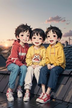 Two happy little boys and a little girl sat on the roof, taking full body photos and laughing happily. The boy wore a yellow short Sweatshirt, red sneakers, and the girl wore a white sweatshirt, jeans, white sneakers, black hair, a house, flowers, Hayao Miyazaki and other small animals. A happy little boy with a round face, big eyes, long eyelashes, sunset and sunset,