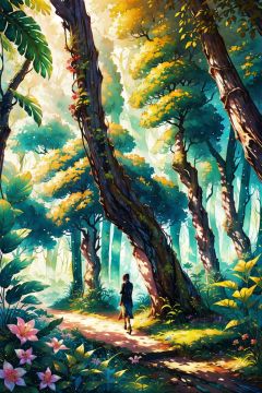 (illustration by antony gormley:0.8), 8K,HD,ultra detailed, dreamy perspective,a lady finds herself in a fantastic forest with towering trees radiating a mysterious light from their canopies. She walks down a path and encounters magical creatures and breathtaking plants, ultra detail, frosty anime stye